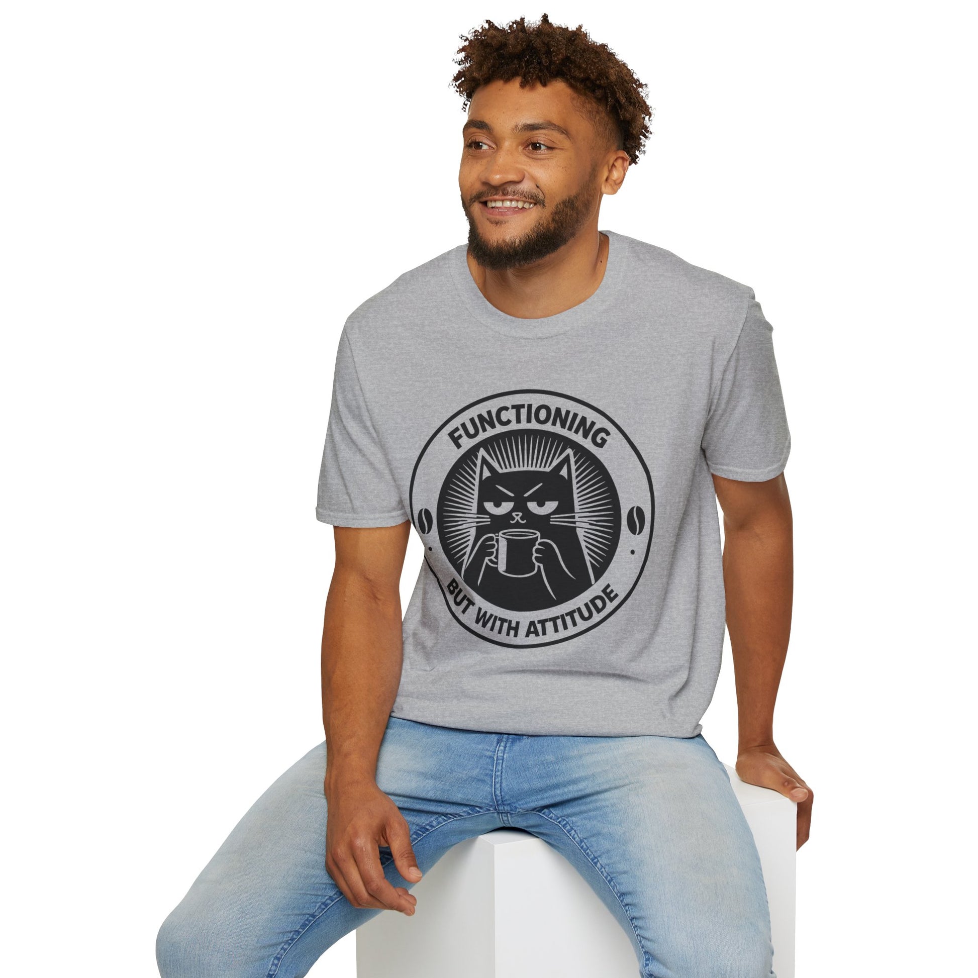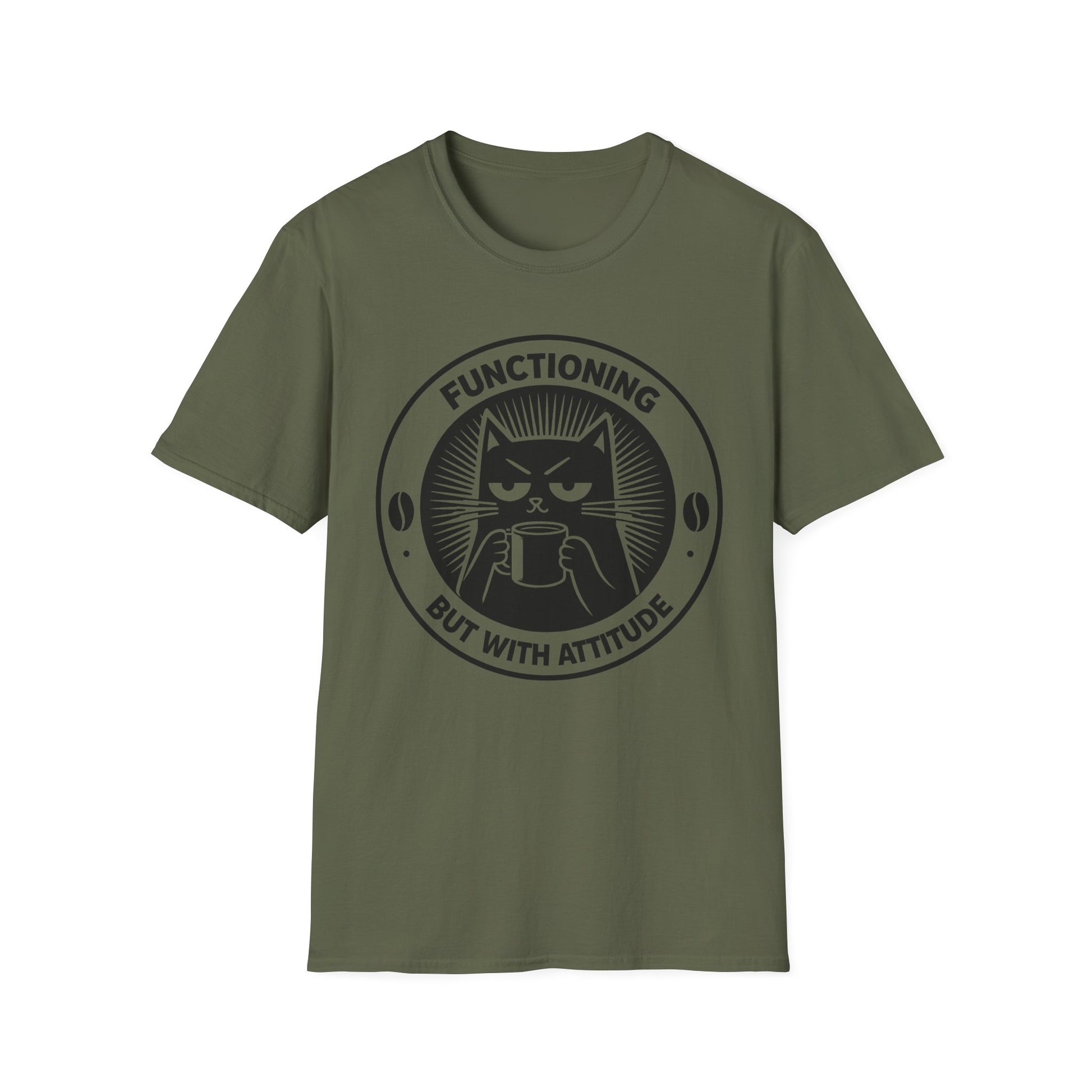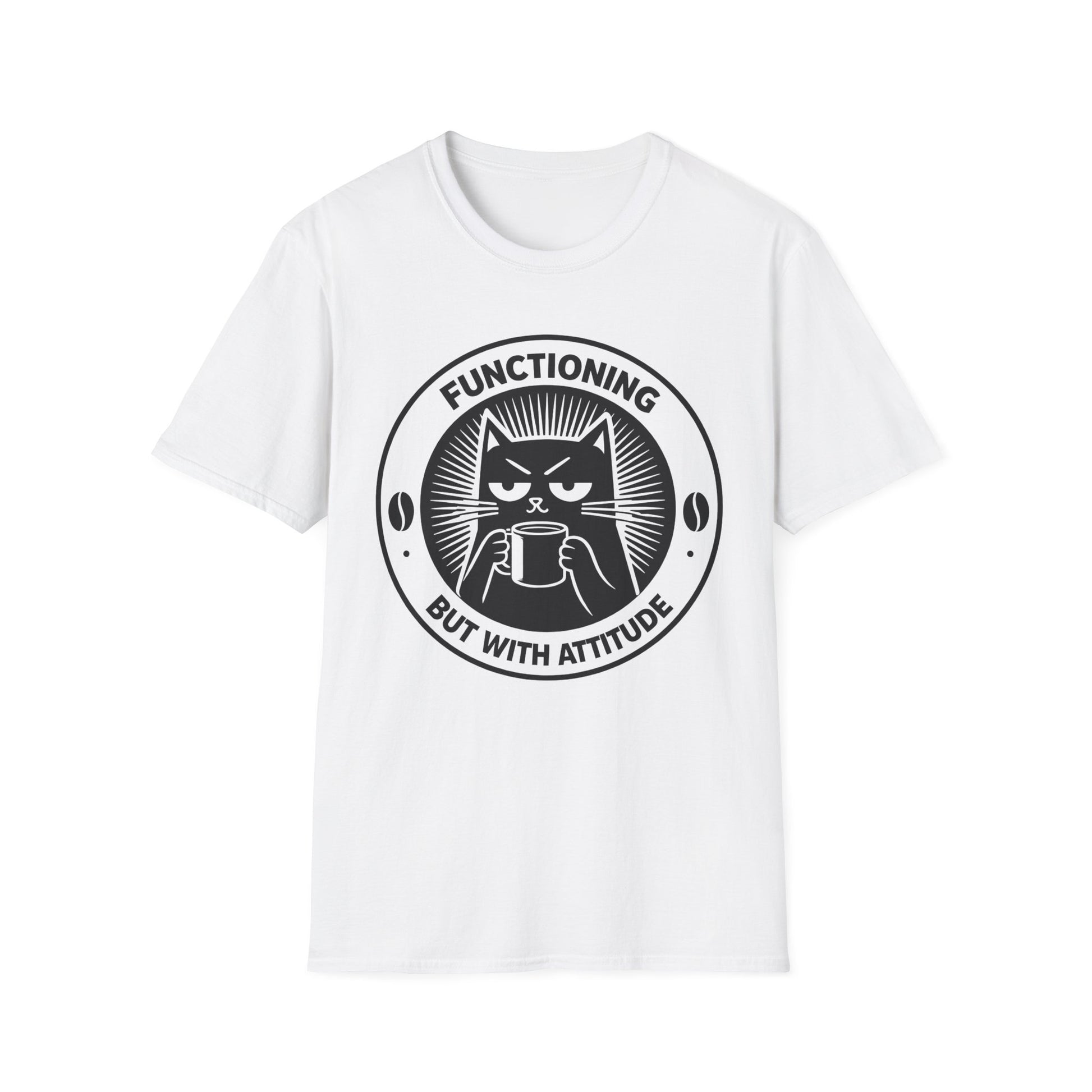 This lightweight crew neck shirt carries quiet attitude. A minimalist black-and-white emblem shows a sleepy, coffee-holding cat framed by the words “Functioning but with attitude,” turning a morning ritual into a small, wry statement. The soft ring-spun cotton feels smooth against skin and the classic fit layers easily under jackets or stands alone on laid-back days. It’s the kind of tee you reach for when you want comfort and a little dry humor to start the day — cozy, breathable, and honest.