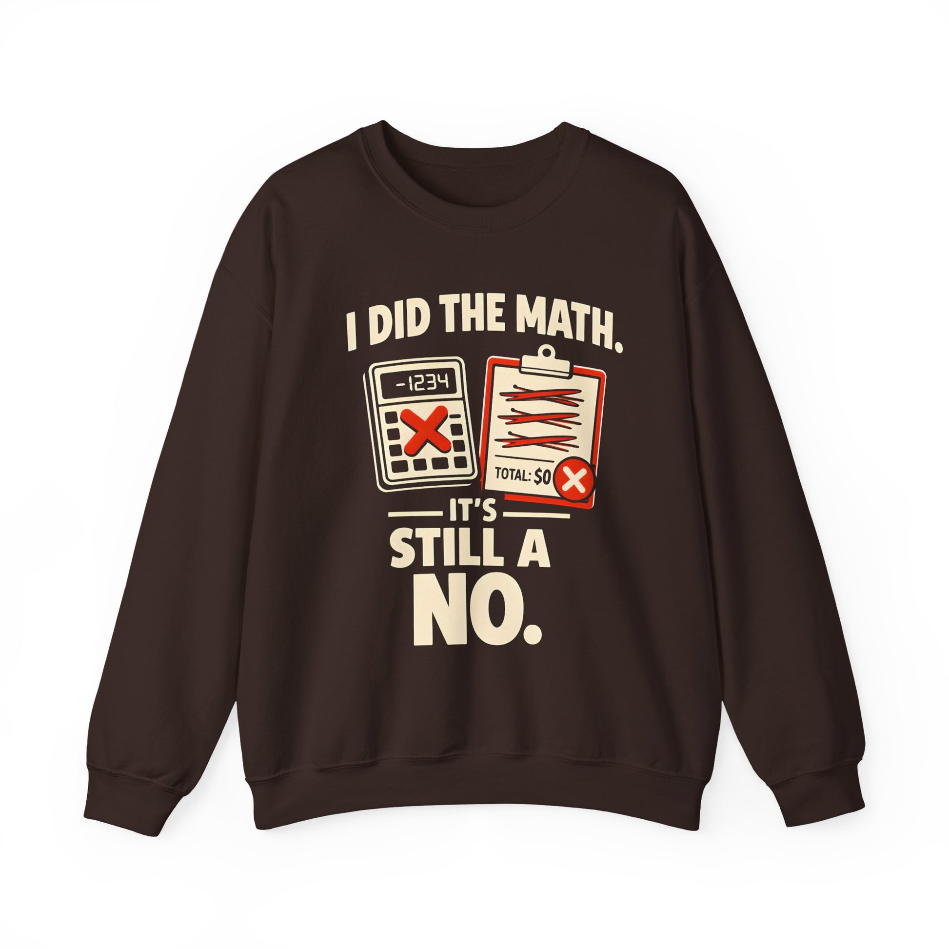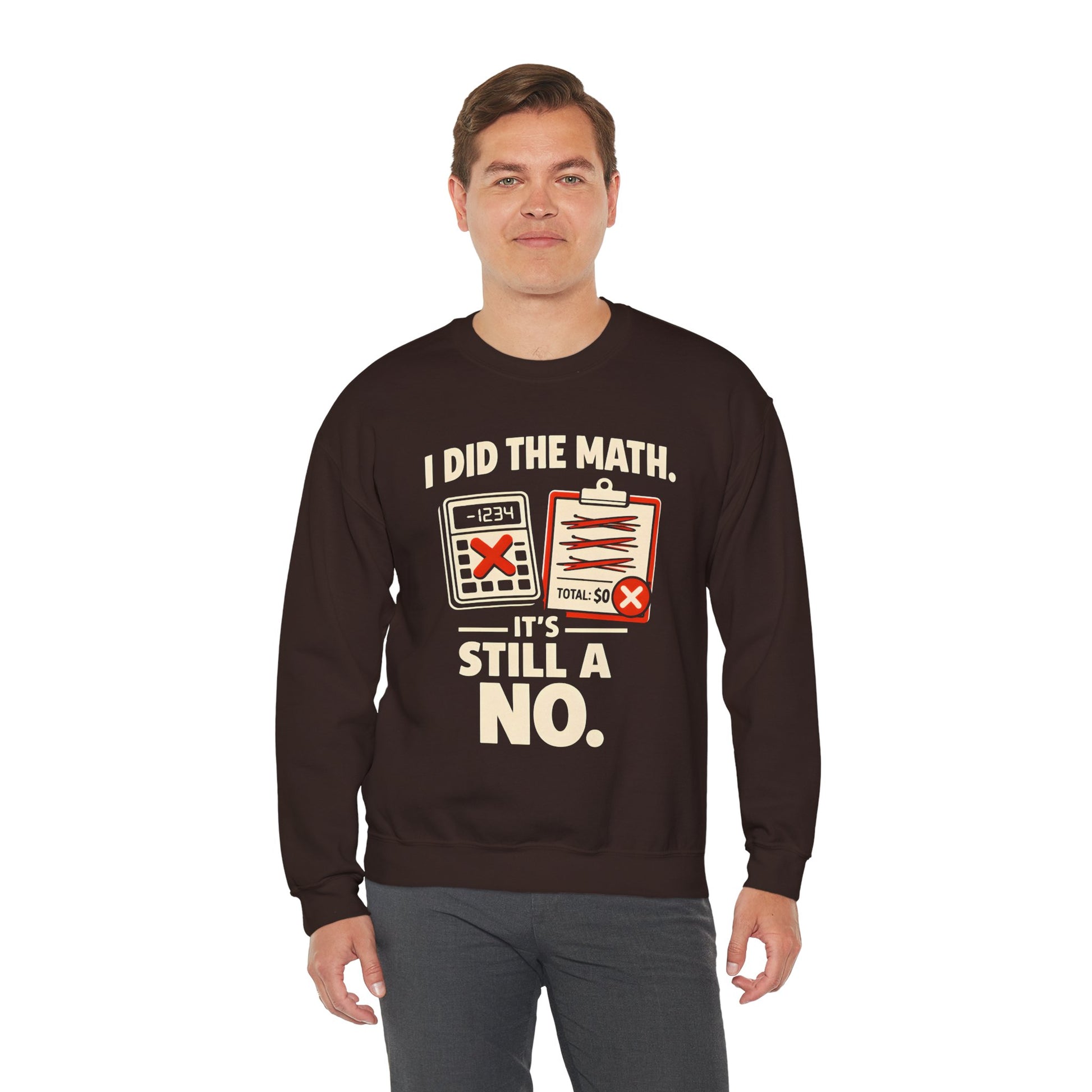 Lightweight confidence wrapped in a soft, dependable crewneck. This sweatshirt carries a wry, math-nerd sense of humor — an illustrated calculator and crossed-out total announcing, “I did the math. It’s still a no.” It sits casually on the body with a classic crew neckline and clean lines, so it works as an easy layer for late-night study sessions, campus lectures, or low-key coffee runs. The muted print colors pop on the dark fabric without shouting, and the soft 50/50 cotton-poly blend keeps it cozy without overheating. Wear it when you want to make a dry joke without saying a word — a comfortable, durable piece that feels lived-in from day one.
