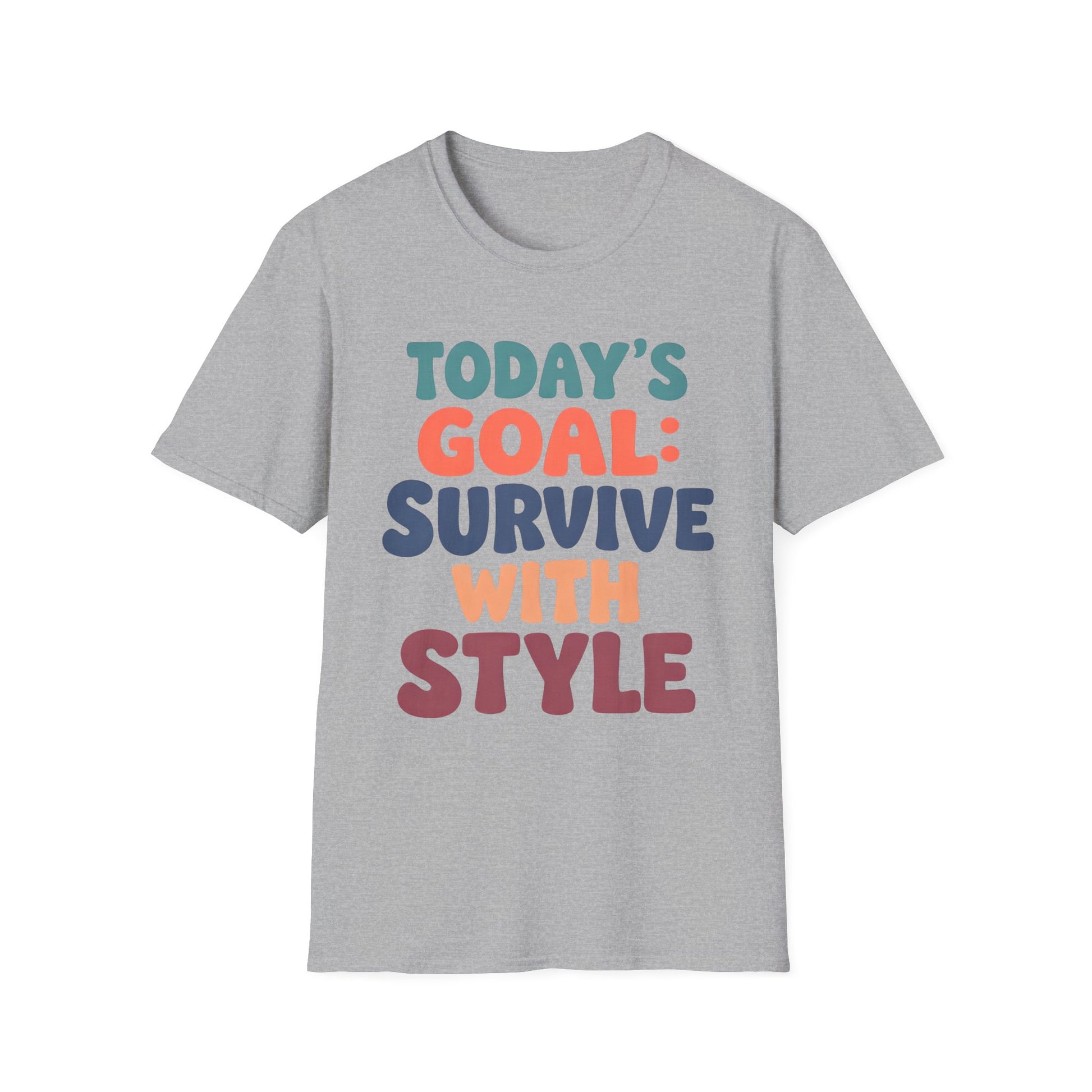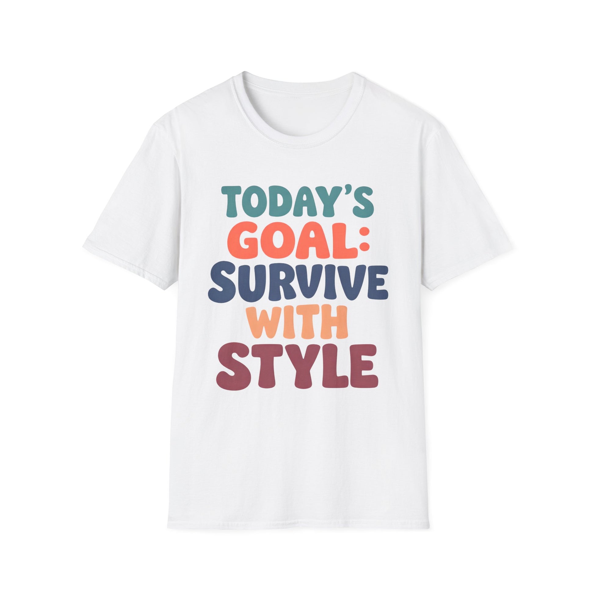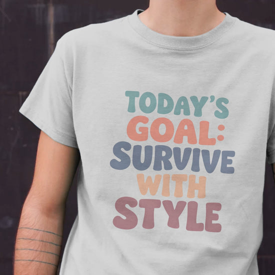 Lightweight, soft, and a little cheeky — this t-shirt speaks to the days you need a confidence boost and a grin. The relaxed crew neck and classic fit sit easy while bold, rounded lettering in warm retro hues reads "TODAY'S GOAL: SURVIVE WITH STYLE." Wear it on busy mornings, long shifts, or casual weekend coffee runs to signal resilience with a wink. The smooth ring-spun cotton feels gentle against the skin and keeps printed colors crisp. It layers under jackets or stands on its own when you want to keep things simple but expressive.