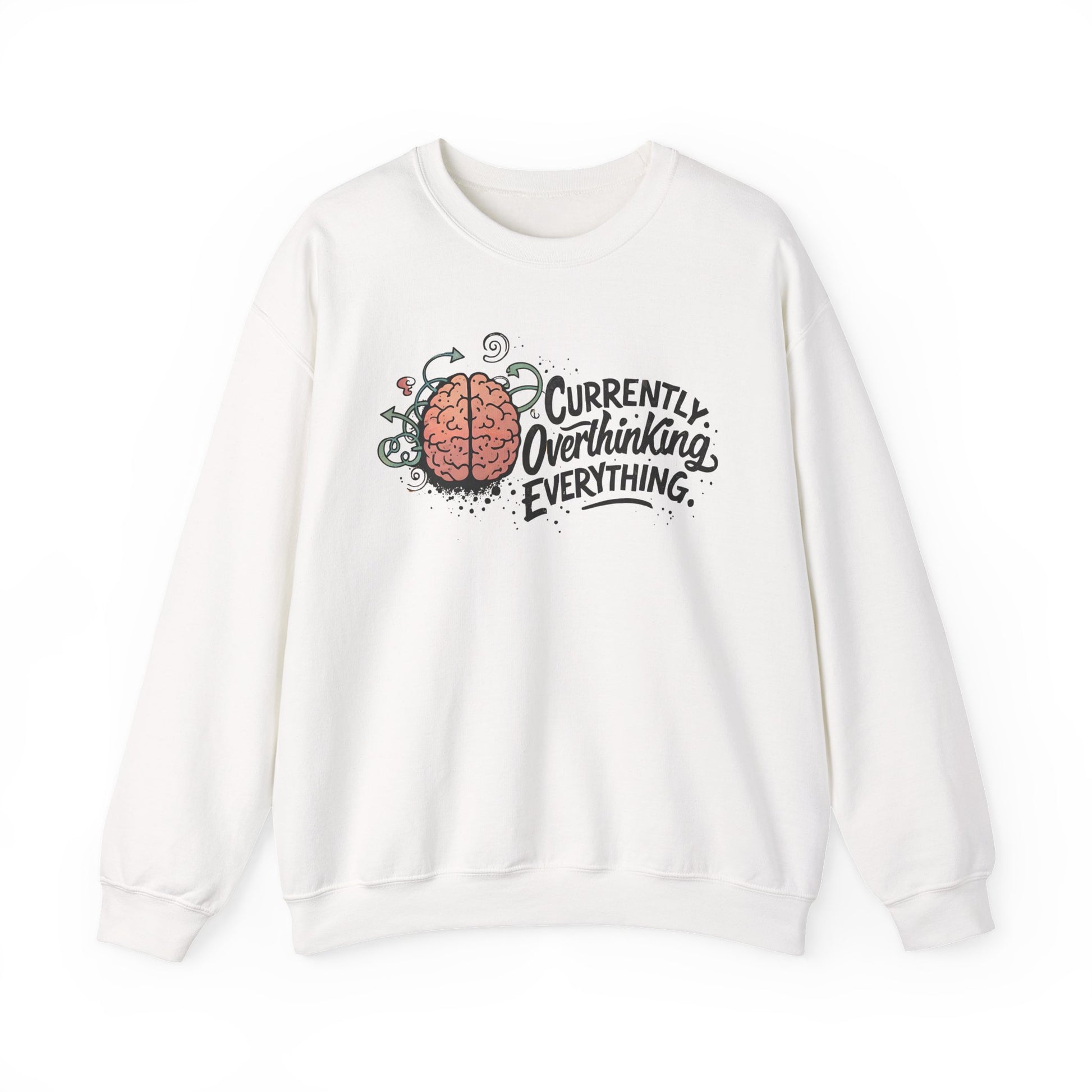 This cozy crewneck sweatshirt speaks to the brain-in-overdrive crowd with a playful, hand-drawn design: a cartoon brain tangled in little thought-lines beside the handwritten phrase “Currently. Overthinking. Everything.” The medium-heavy 50/50 cotton-poly blend gives a soft, slightly substantial drape that holds its shape while staying warm. Classic crew cut and ribbed collar keep the silhouette clean and relatable — great for slow mornings, late-night study sessions, or layering for a walk when your mind won’t quiet down. The neutral white background lets the art stand out, and the quality stitching, tear-away neck label, and ethically sourced cotton make it something you’ll reach for when you want comfort that feels thoughtful as well as familiar.